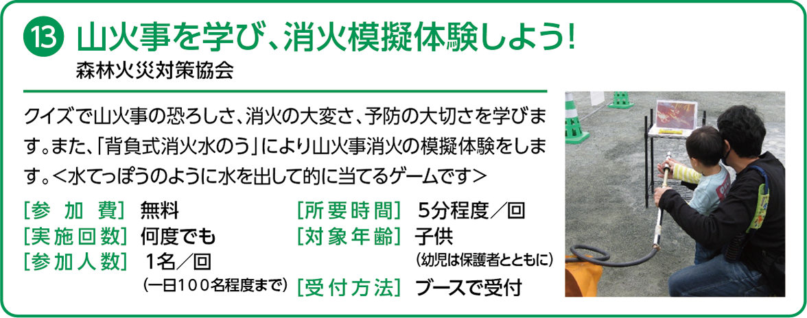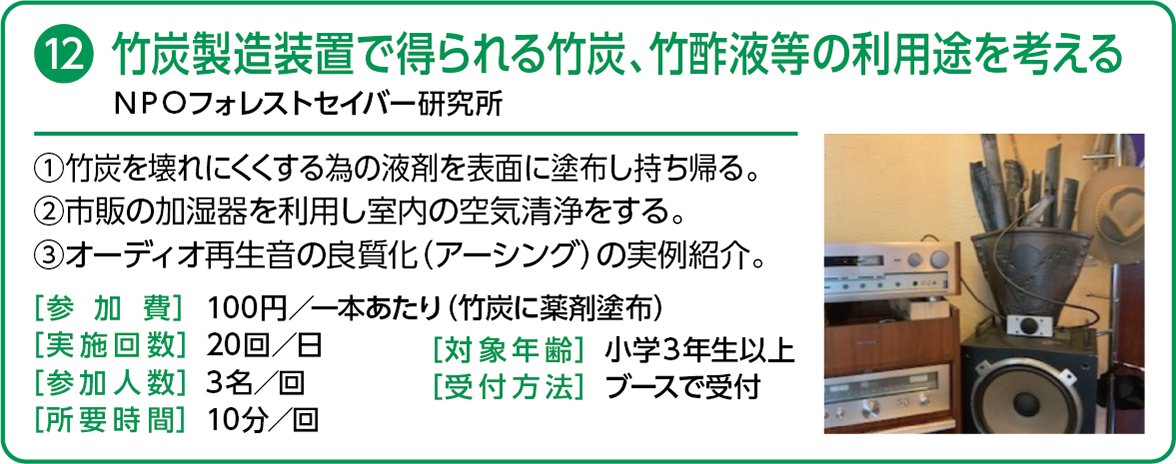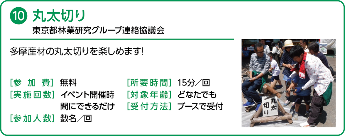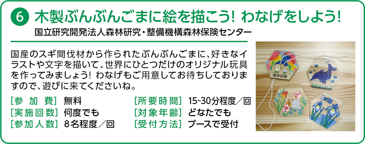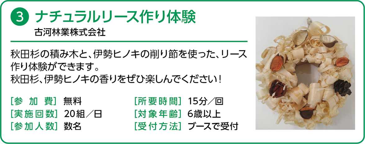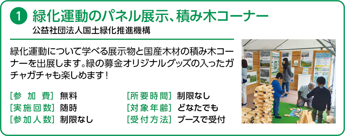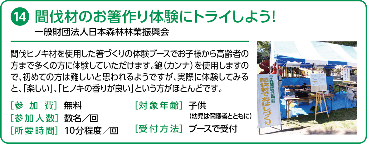 ・ステージ(アルプホルン演奏会、石川の森と木!ゲーム大会等)、体験ブース(間伐材と竹で遊ぼう、しいたけ植菌体験、バードコール作り、年輪キーホルダー作り、木育体験コーナー)等