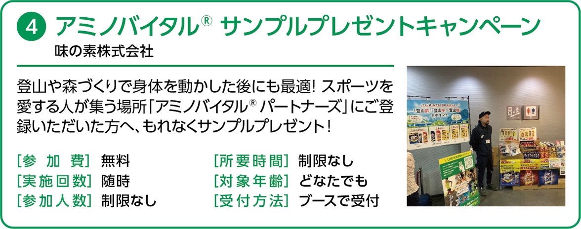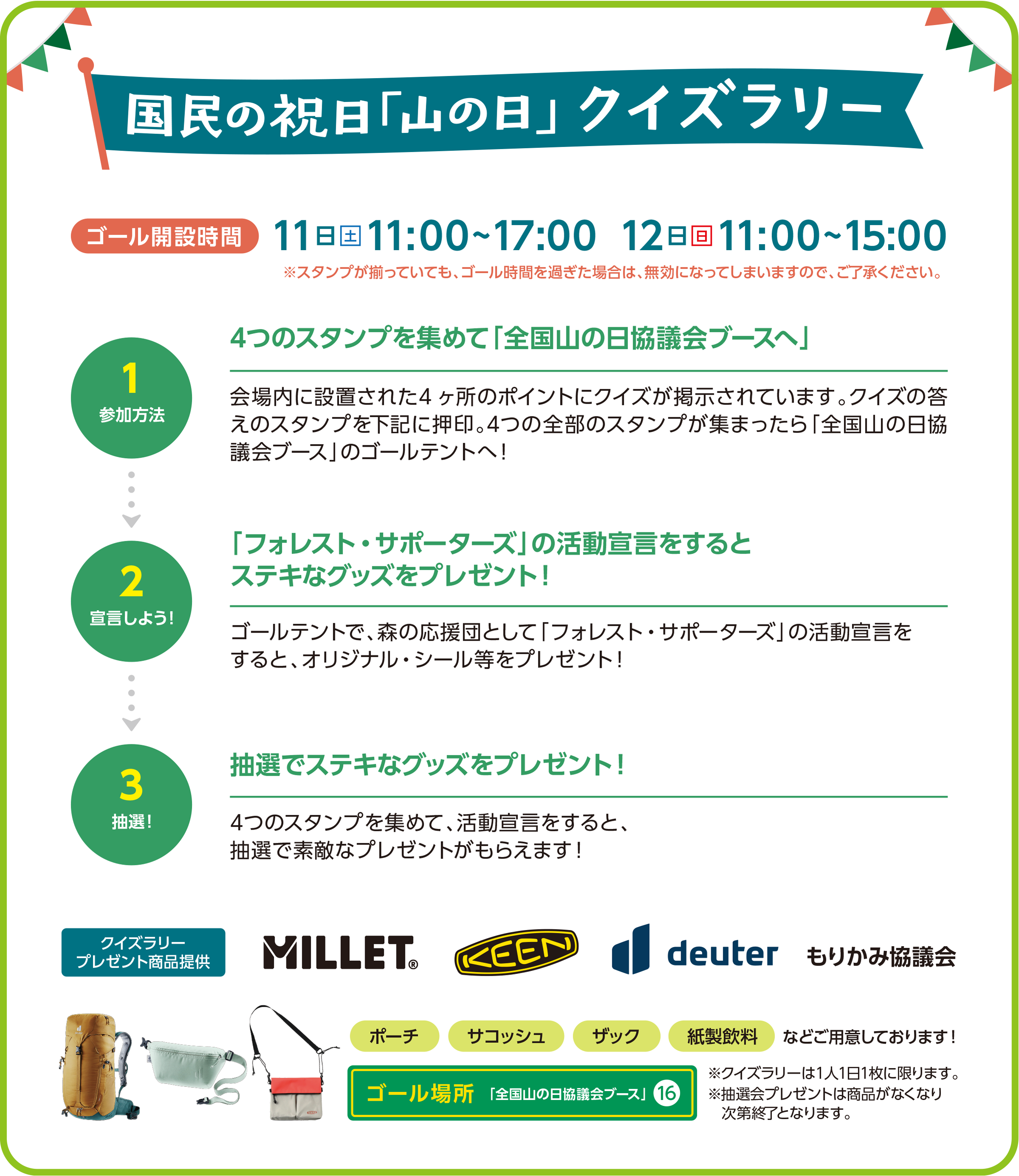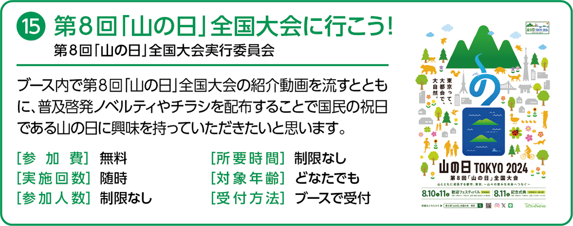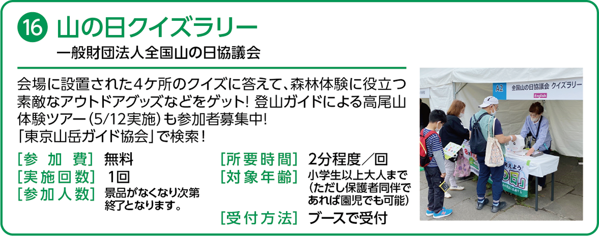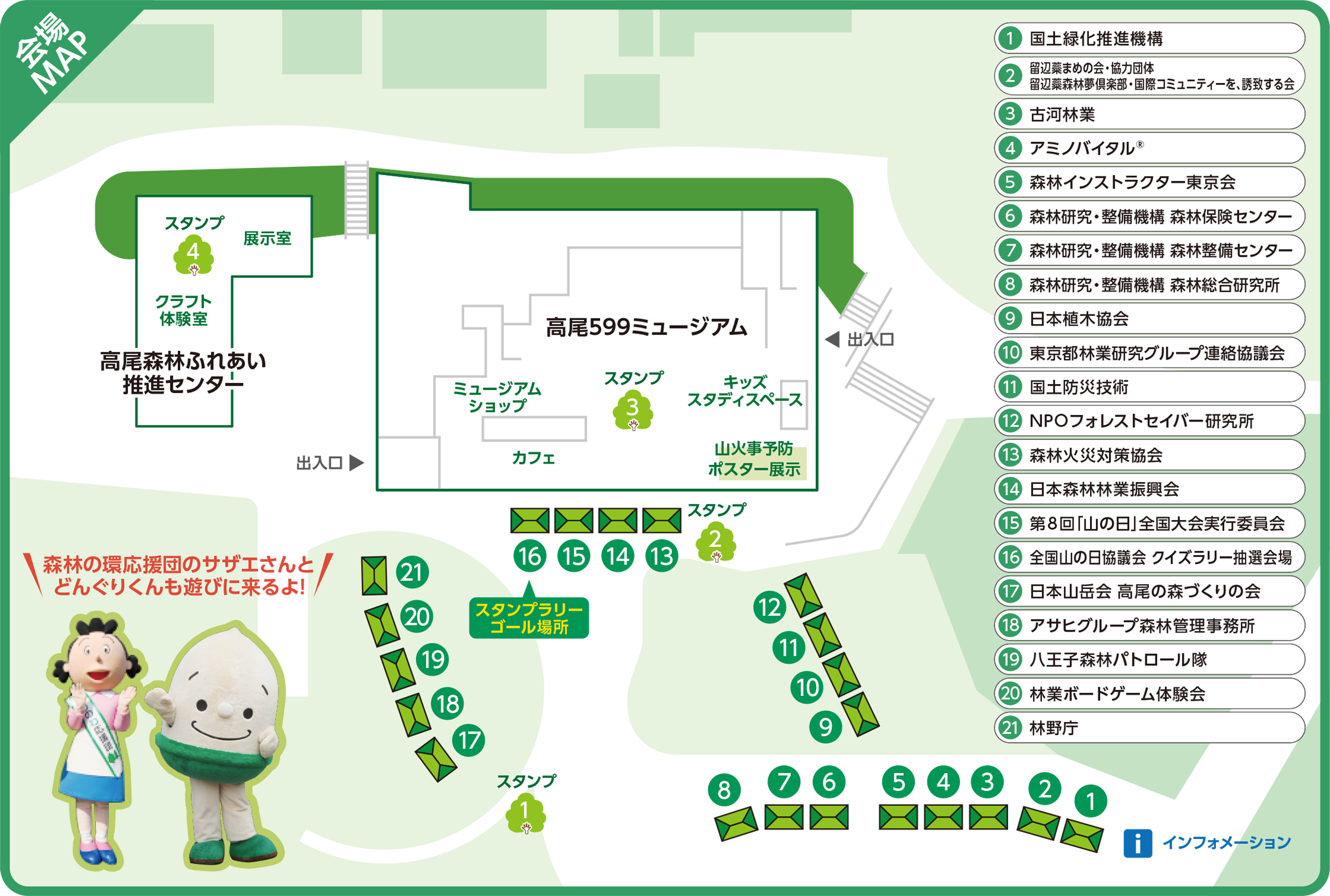 ・ステージ(アルプホルン演奏会、石川の森と木!ゲーム大会等)、体験ブース(間伐材と竹で遊ぼう、しいたけ植菌体験、バードコール作り、年輪キーホルダー作り、木育体験コーナー)等