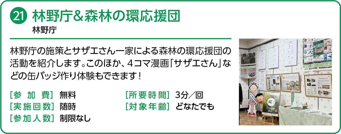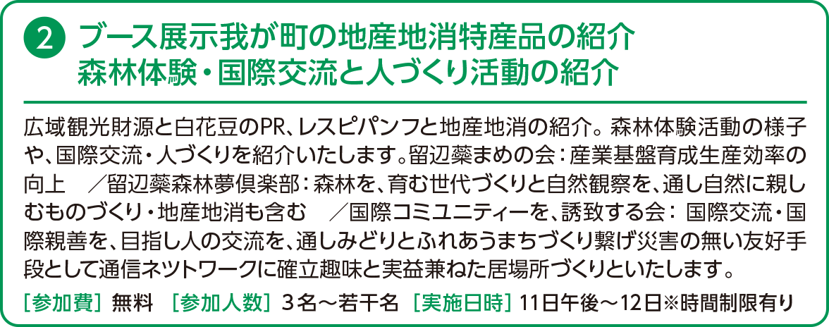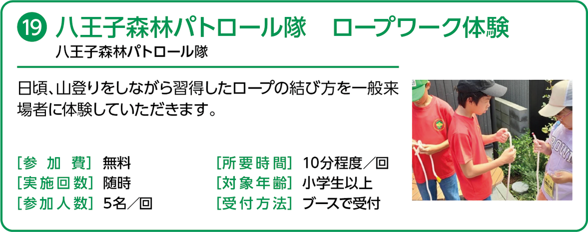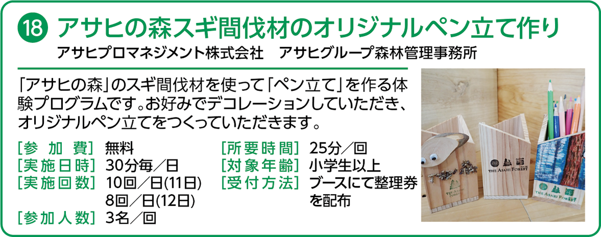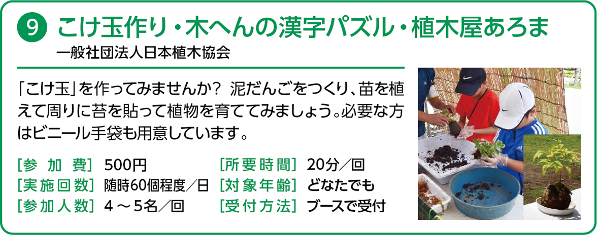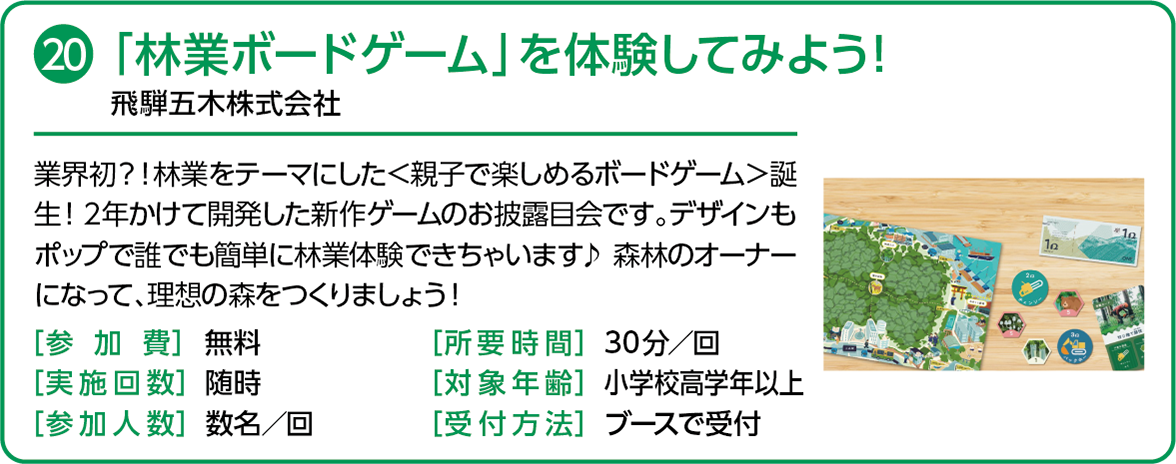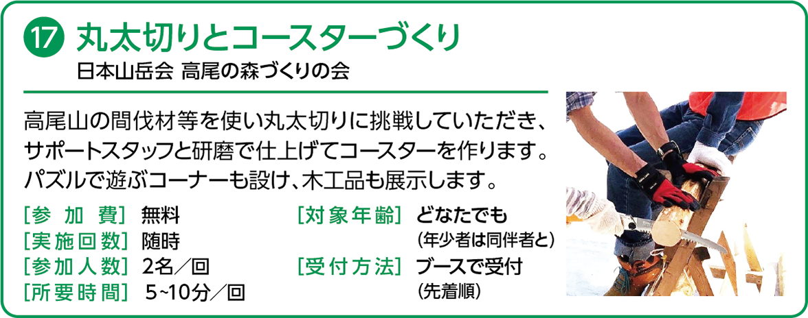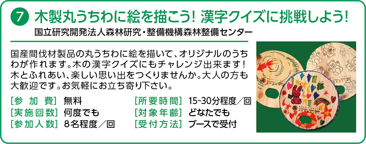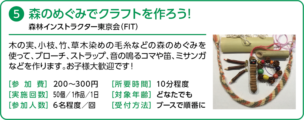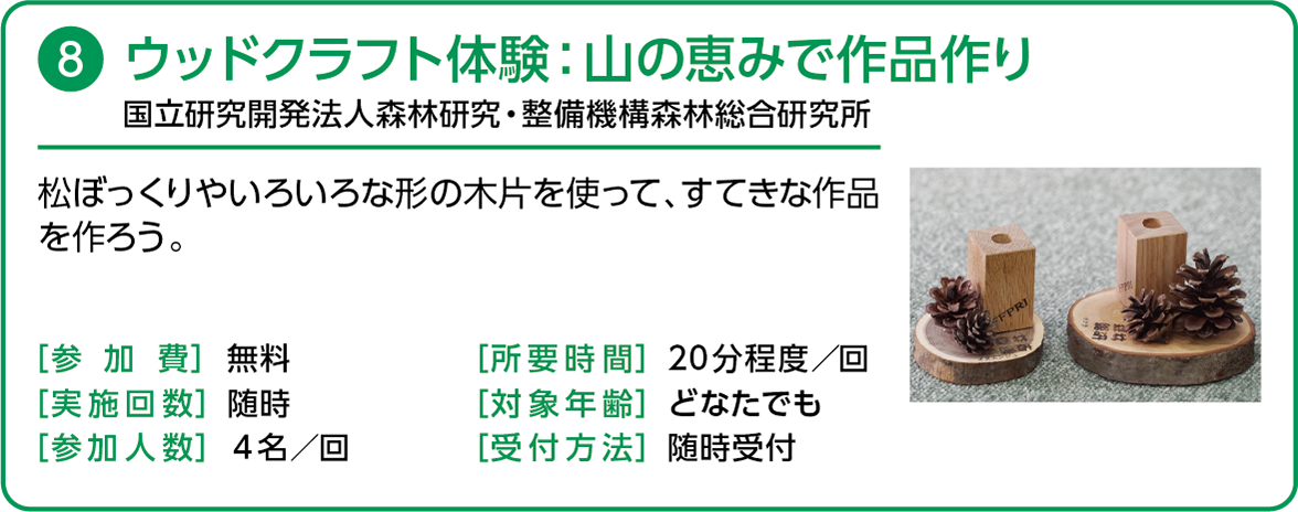 ・木工教室、寄せ植え教室、ネイチャーゲーム、木工品展示販売、自由工作塾、たね団子を作ろう、森の安全作業を学ぼう、空から森を眺めよう、その他販売・展示